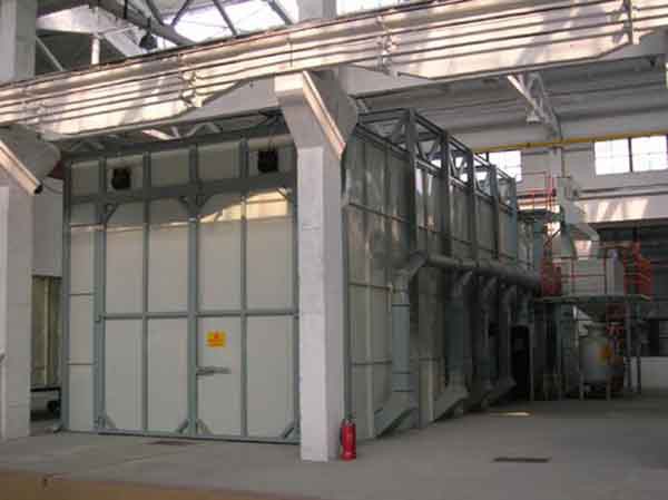 環保零排放內循環式自動91视频成人下载污房係統設備滿足對大氣中粉塵零排放環保嚴格要求,同時91视频成人下载污房內91视频成人下载污作業時粉塵少、照明亮度大於400勒克斯、勞動防護保障好等特點,從而達到91视频成人下载污房內91视频成人下载污作業工作環境。環保91视频成人下载污房係統設備配置為:鋼結構+夾心彩板91视频成人下载污房室體、91视频成人下载污房室體內層為3mm鋼板外敷高耐磨橡膠板,並配置兩套折疊推拉大門;91视频成人下载污機為ACME-4W-2A型單倉保壓式電控雙槍壓送91视频成人下载污機,磨料回收分選係統為局部地坑水平皮帶輸送機構、垂直鬥式提升機、旋轉丸塵分離器式分離器;除塵係統采用KLT4-36濾筒除塵器,工件輸送機構為軌道小車與旋轉轉盤,電氣控製係統均采用施耐德、西門子等品牌電氣元件。